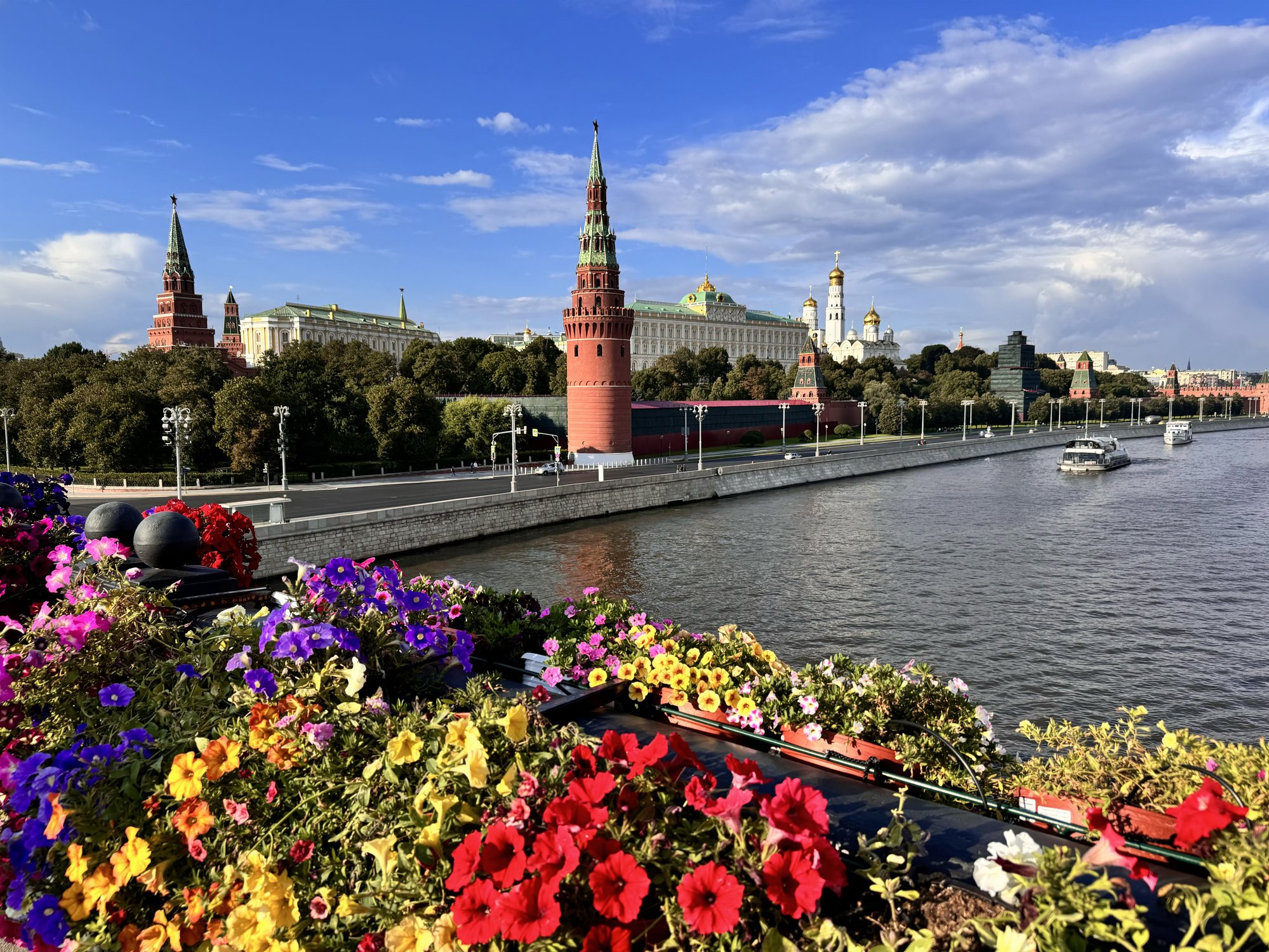 На фотографии, сделанной в августе, изображен Кремль и Александровский сад. Величественные башни Кремля возвышаются над спокойными водами Москвы-реки. Яркие цветы на переднем плане оживляют строгие линии исторической архитектуры. Летний день под голубым небом подчеркивает красоту и величие столицы, объединяя природу и архитектурные символы Москвы в одном кадре.