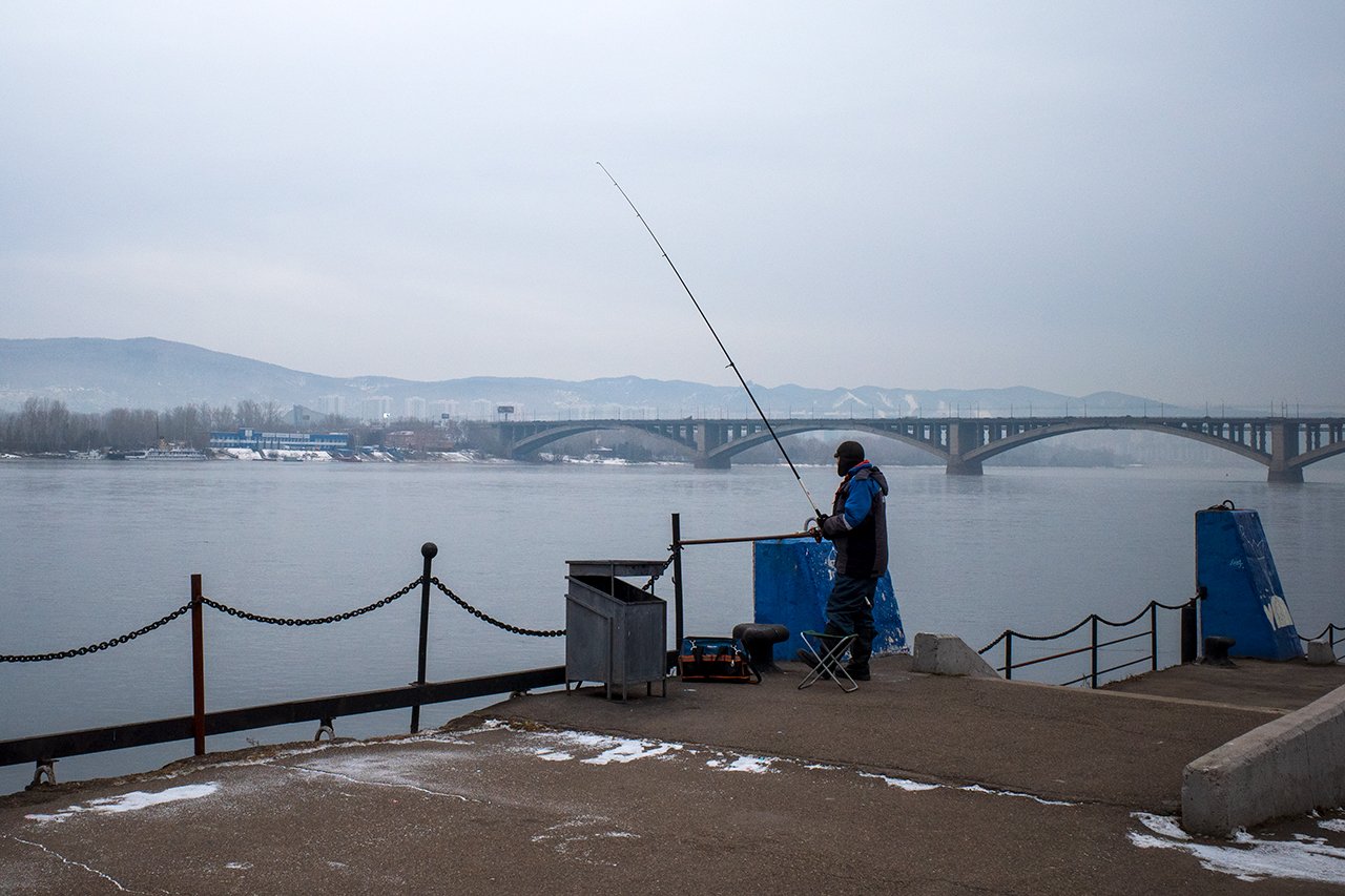 Рыбак на Енисее в центре Красноярска. На фоне - Коммунальный мост, который изображен на десятирублевой купюре