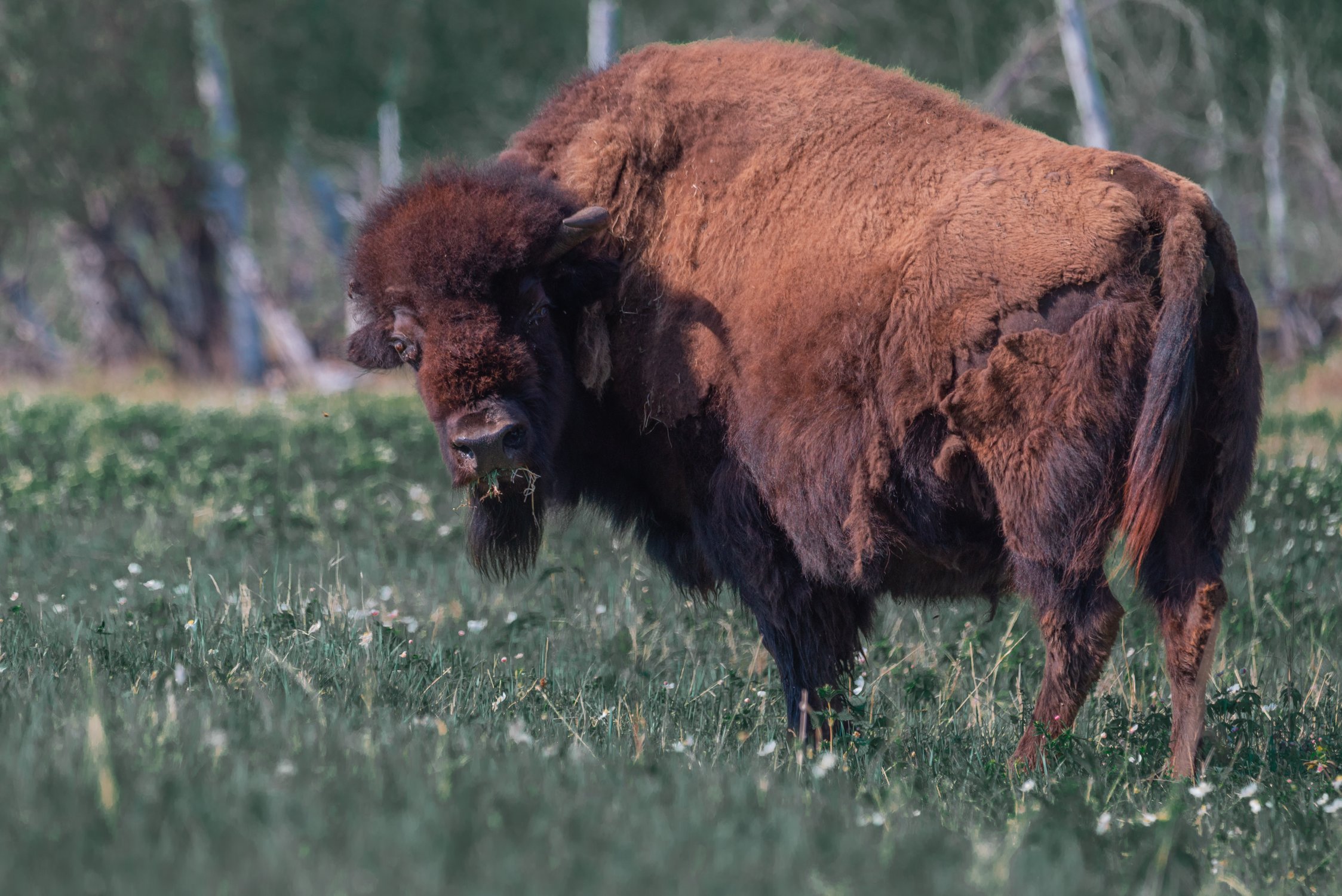 Бизоны начинают активно линять с наступлением теплового времени в Якутии. Этот питается свежей травой. Бизонарий Усть-Буотома, июнь, Якутия.