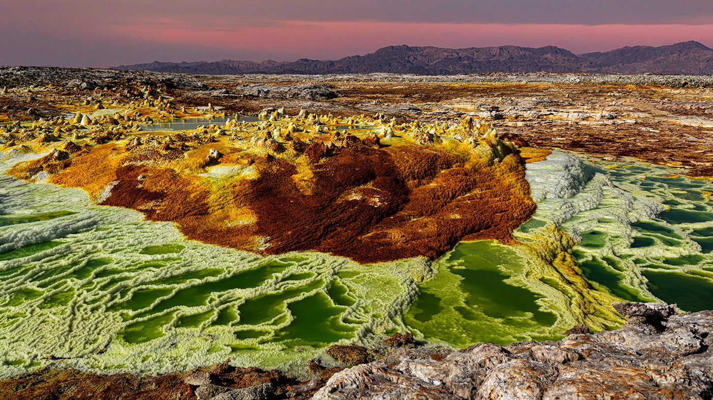 Даллол — действующий вулкан во впадине Данакиль, на северо-востоке Эфиопии, известен своими неземными пейзажами, похожими на поверхность Ио, спутника планеты Юпитер.