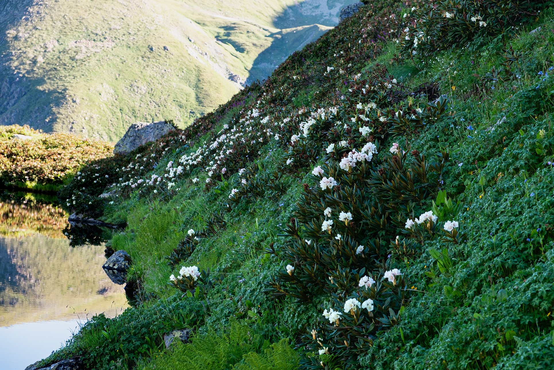 Цветение белого рододендрона в районе Загеданских озёр, Карачаево-Черкесия