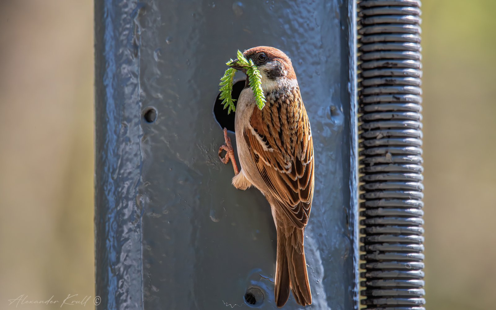 Полевые воробьи облюбовали технологическое отверстие в металлическом столбе освещения, где и строят свое уютное гнездышко.