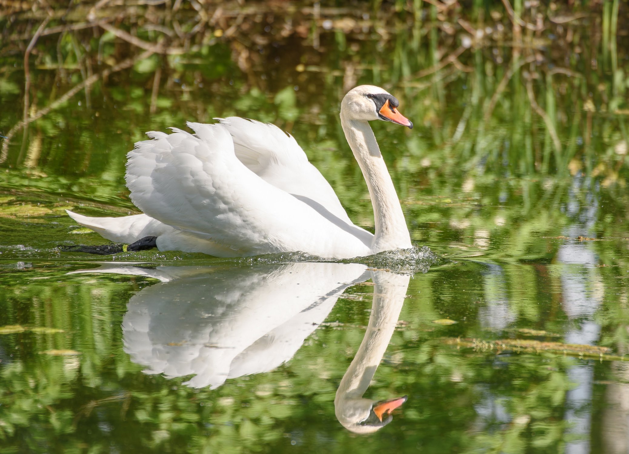 Лебедь-шипун Георгий плывёт по изумрудной глади воды; дивный её цвет в отражении получился благодаря молодой листве.