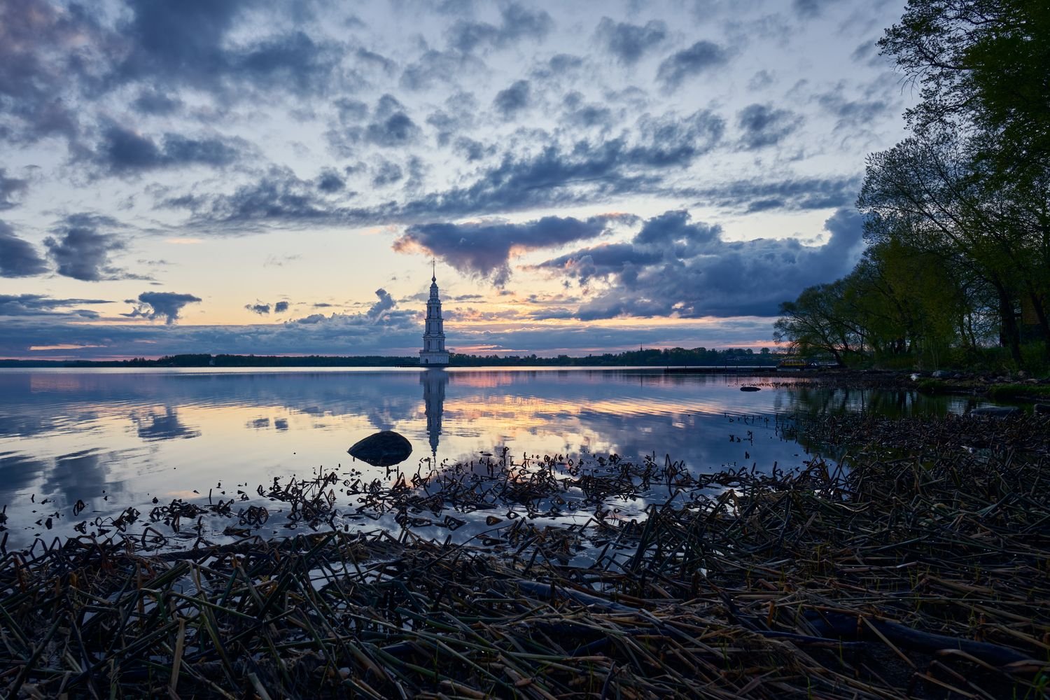 Вид колокольни с камнем на переднем плане. Сзади виднеются первые лучи, поднимающегося солнца... Калязин.