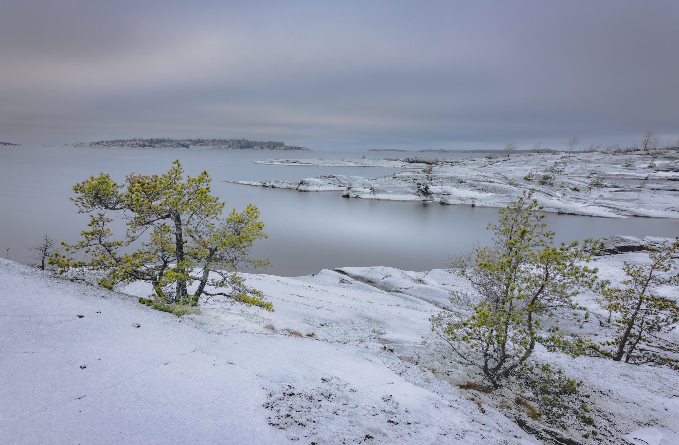 Переходы скал, слегка припорошенным мелким снегом, и воды в вечерний час на Ладоге едва заметны. Лишь цветовые акценты сосен на берегу оттеняют предзакатную пастель воды и камня.