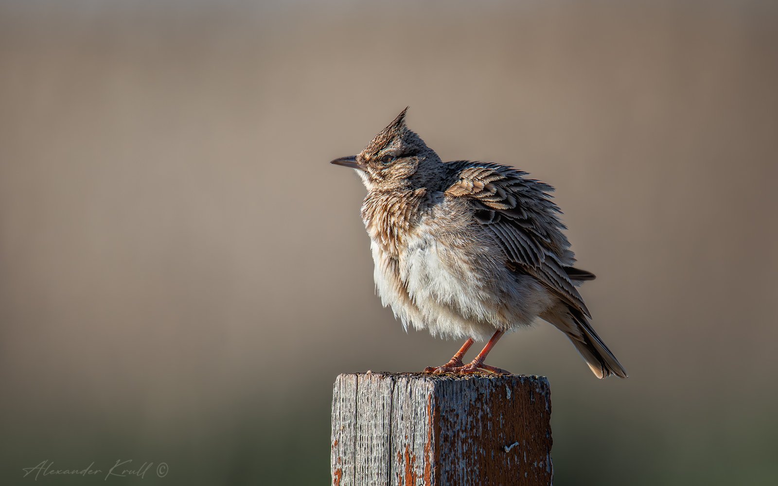 Раннее утро, прохладно. Солнце только появилось и хохлатый жаворонок, взъерошившись на деревянном столбике, встречает новый день.