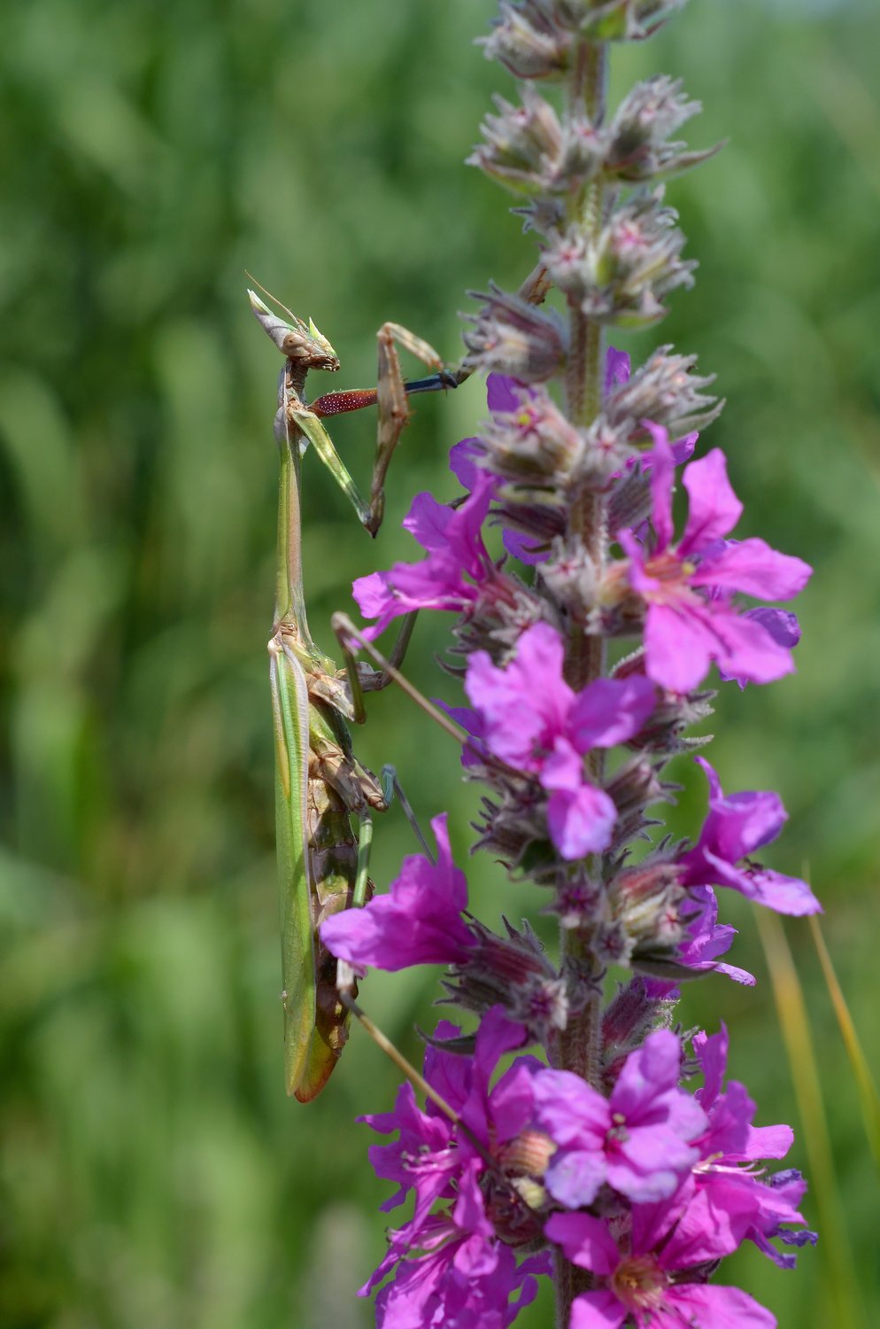 Самочка эмпузы полосатой (Empusa fasciata) на дербеннике. Красная книга Крыма и Севастополя, редкий вид.