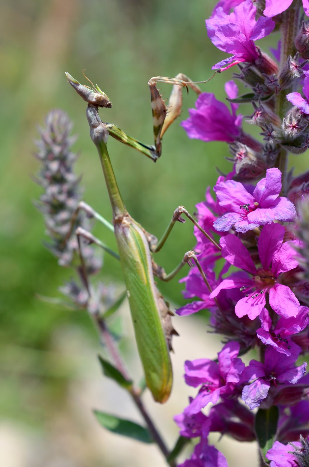 Самочка эмпузы полосатой (Empusa fasciata) на дербеннике. Красная книга Крыма и Севастополя, редкий вид.