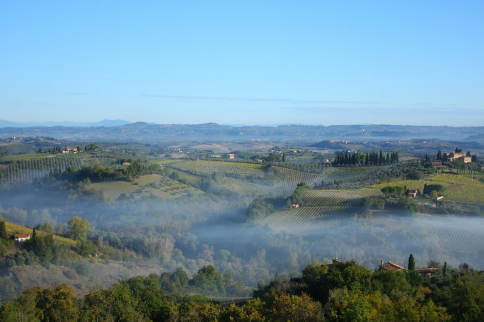 Средневековый городок Сан-Джиминьяно славиться своими древними башнями (за что его прозвали "Нью-Йорком средневековья"), мороженым. Однако, для себя я открыл прекрасный рассветный вид на местные долины, когда они покрыты нежной пленкой тумана, скрывая красоту ровных линий виноградников и оливковых деревьев.