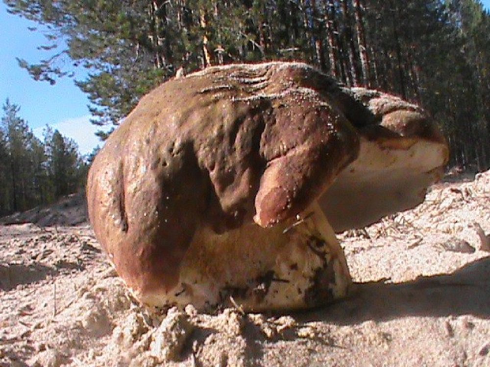 Гриб боровик вырос на самой дороге, немножко очистили от песка, и оказался целый великан.
