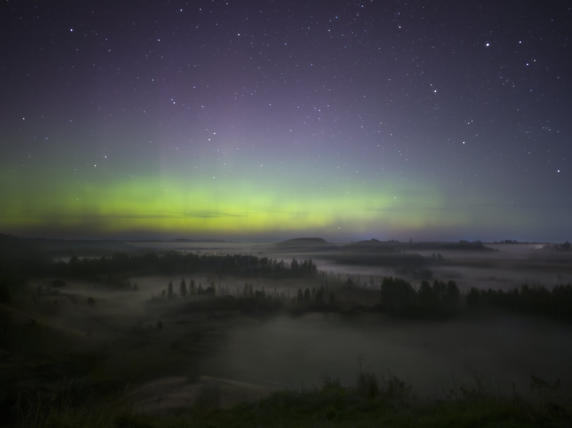 Ночная тишина окутывает землю лёгким туманом, а над горизонтом раскрывается танец северного сияния. Зелёные и фиолетовые волны света мягко сливаются с мерцанием звёзд, создавая ощущение покоя и вечности. Это мгновение, когда природа словно замерла, чтобы показать своё безмолвное великолепие.