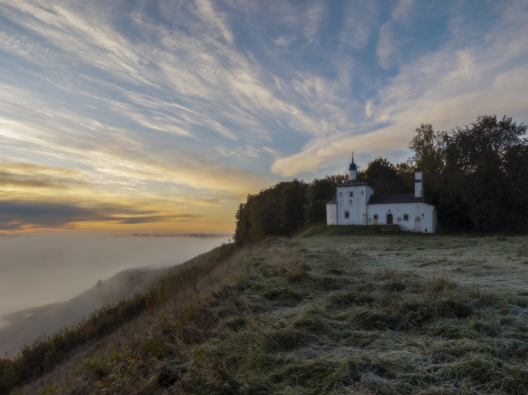 Никольская церковь на рассвете, снизу идёт долина, река и густой туман.