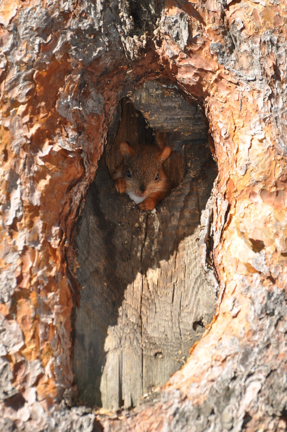 Эта белка позировала в дупле сосна, растущей в лесу ленинградской области. С интересом наблюдала и участвовала в фотосессии