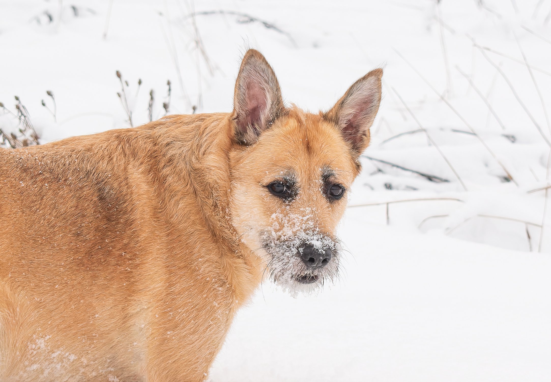 Стёпа, мой самый лучший друг на всём белом свете, тоже очень любит зиму, поэтому с удовольствием валяется в снегу и рыхлит его своим чёрным пятачком. На зимнем лугу в Угличском районе Ярославской области, 27.12.2025 г.