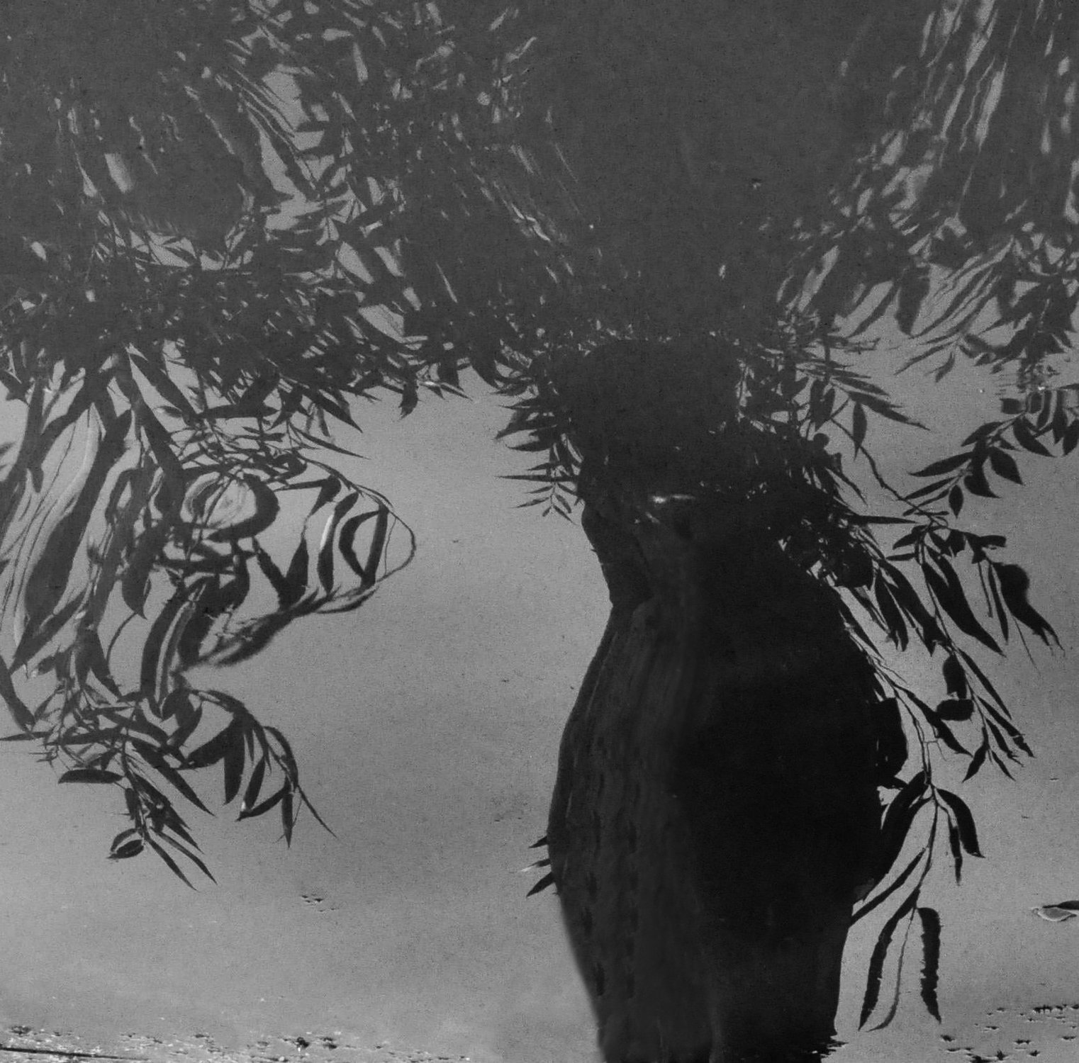 отражение в воде веток деревьев и прибрежных коряг