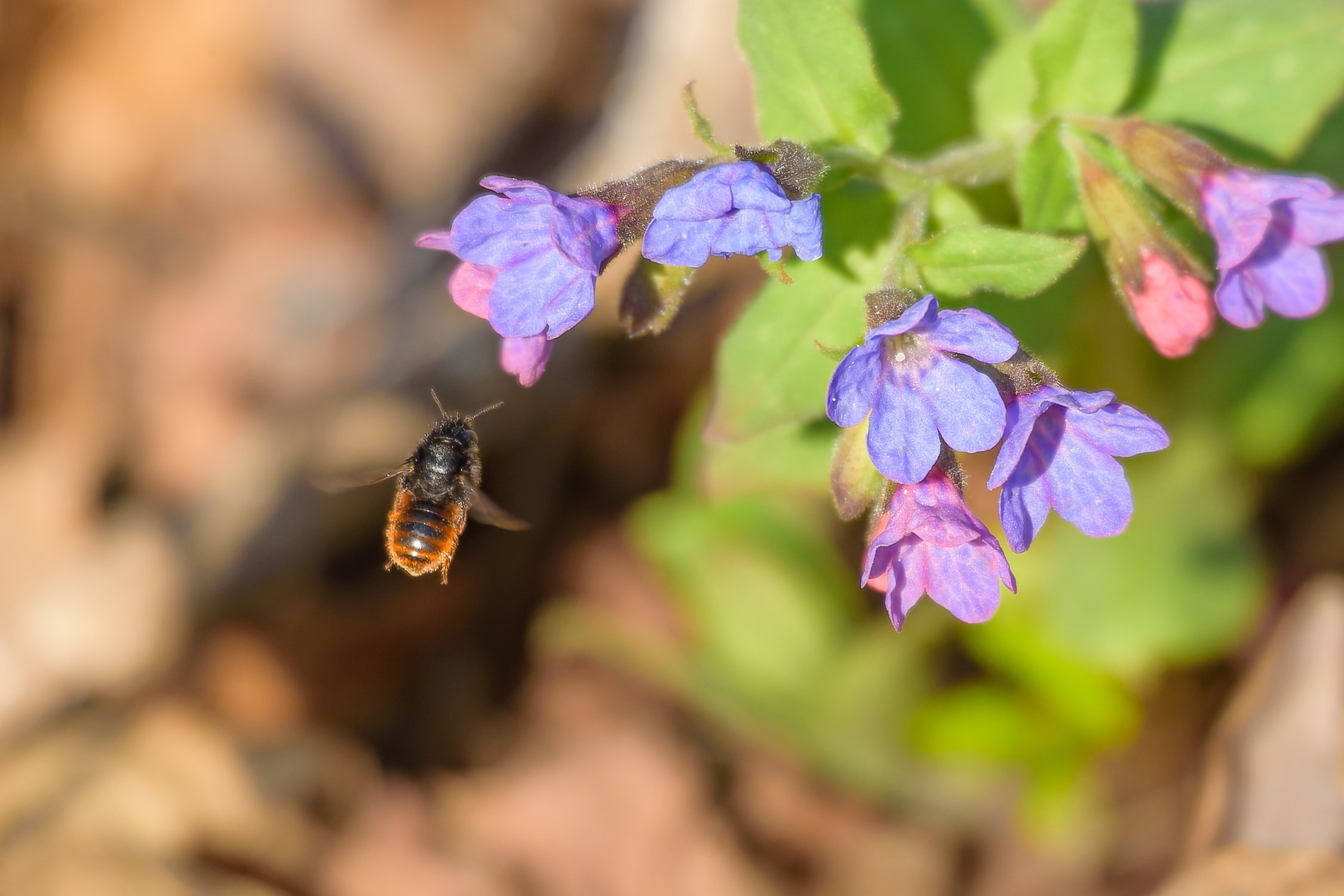 Мохнатая пчела антофора весенняя подлетает к медунице