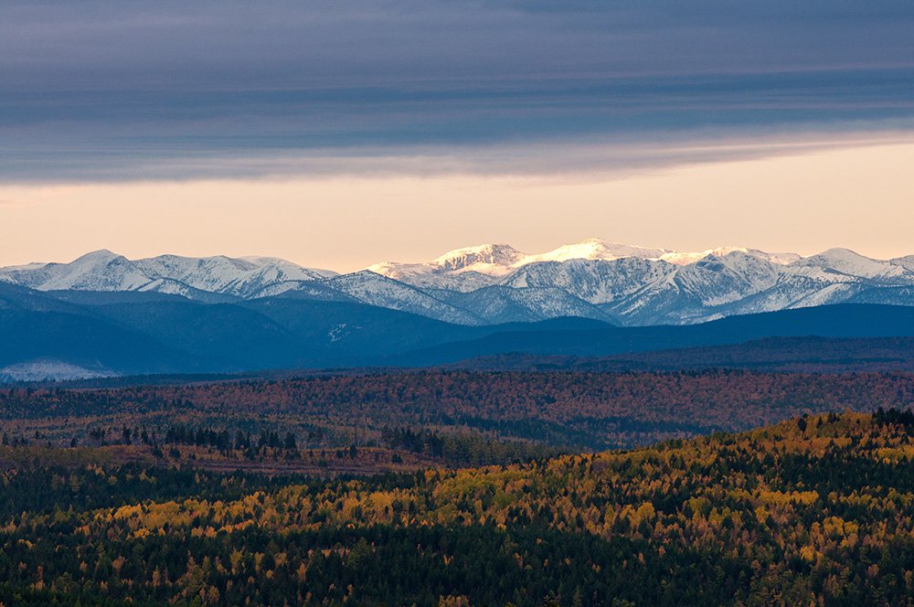 Олхинское плато на фоне хребта Хамар-Дабан и пика Босан, Иркутская область
