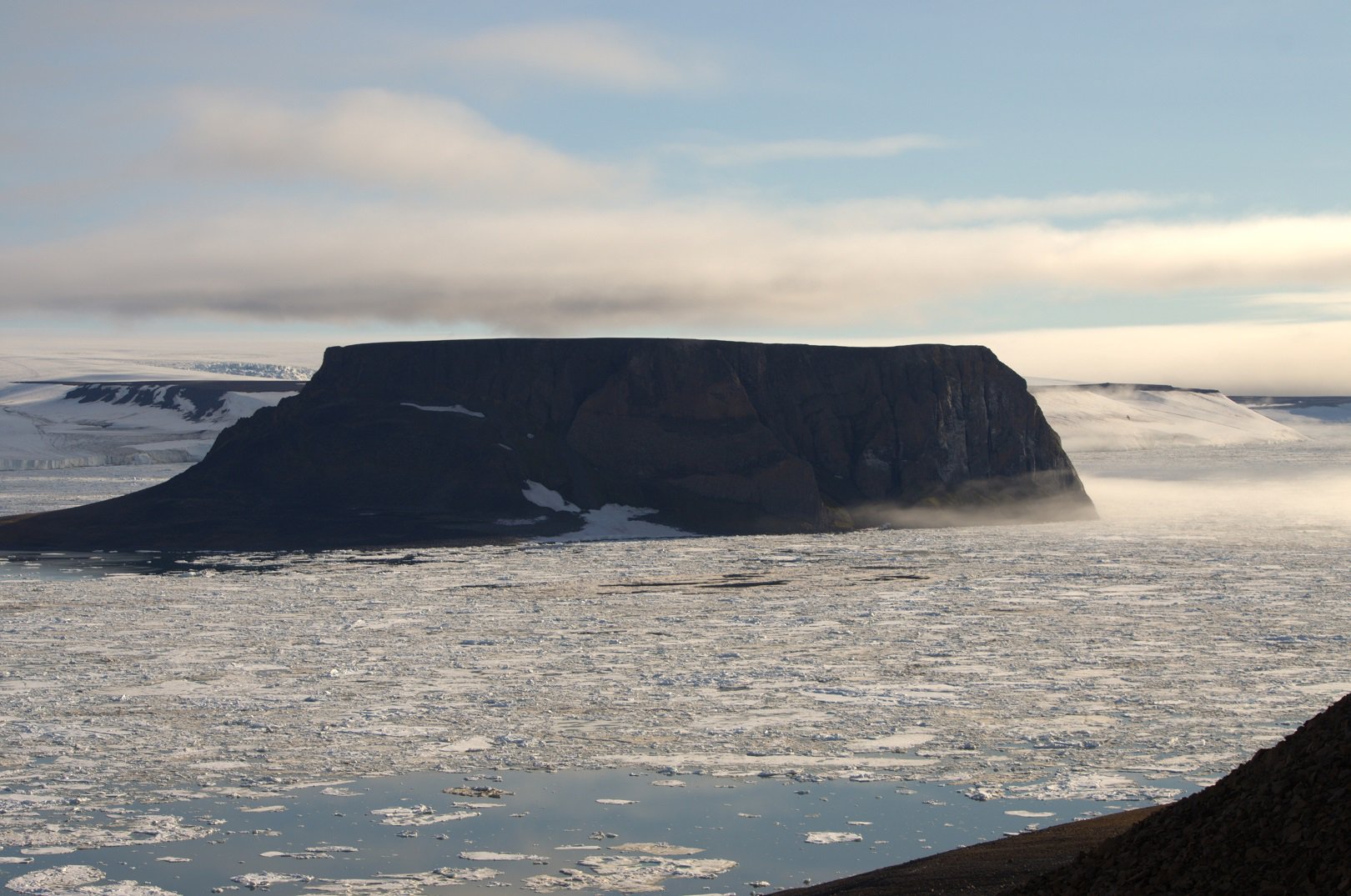 Август 2015, Национальный парк "Русская Арктика", архипелаг Земля Франца-Иосифа, остров Гукера. В процессе поисков следов жизнедеятельности белого медведя, подъём над ледником Седова по снежнику. Через несколько минут скала Рубини полностью скроется в тумане.
