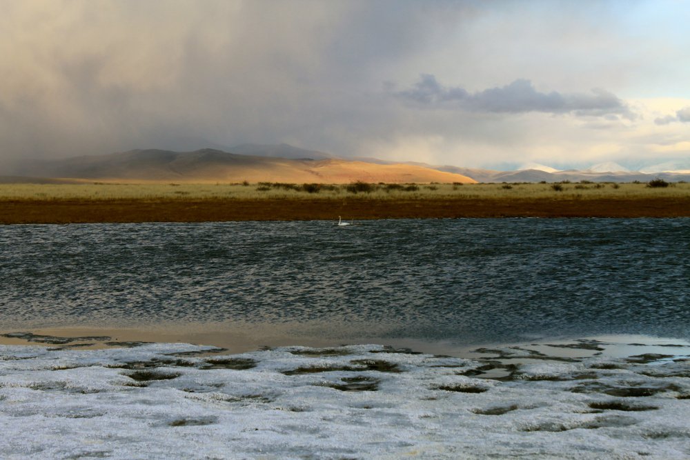 Лебеди, снежные облака, Кош-Агач, Чуйская степь, Горный Алтай, Горы, озеро, закат