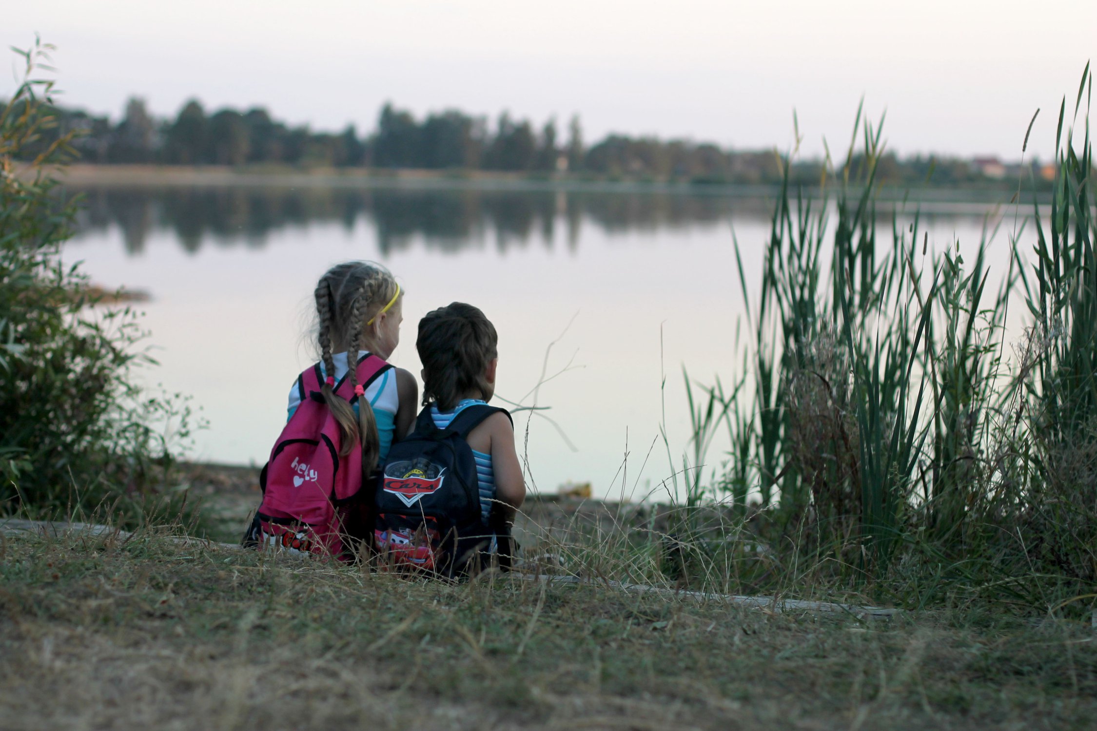 братик с сестренкой на берегу озера