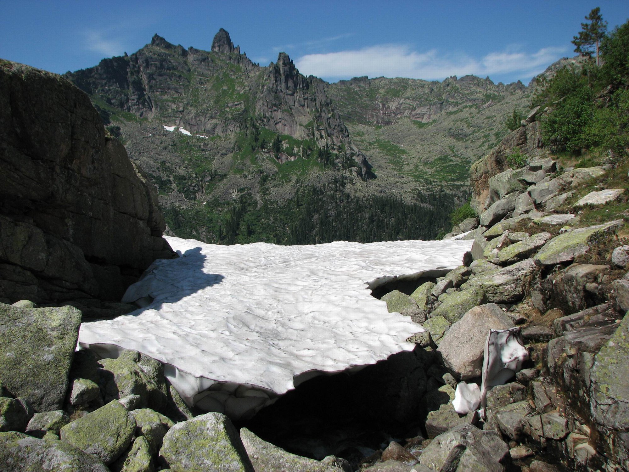 Никогда не тающая снежная арка, под которой водопад низвергается из оз. Горных духов в оз. Художников. Хребет Ергаки Западного Саяна. Снимок сделан в июле 2016 года.