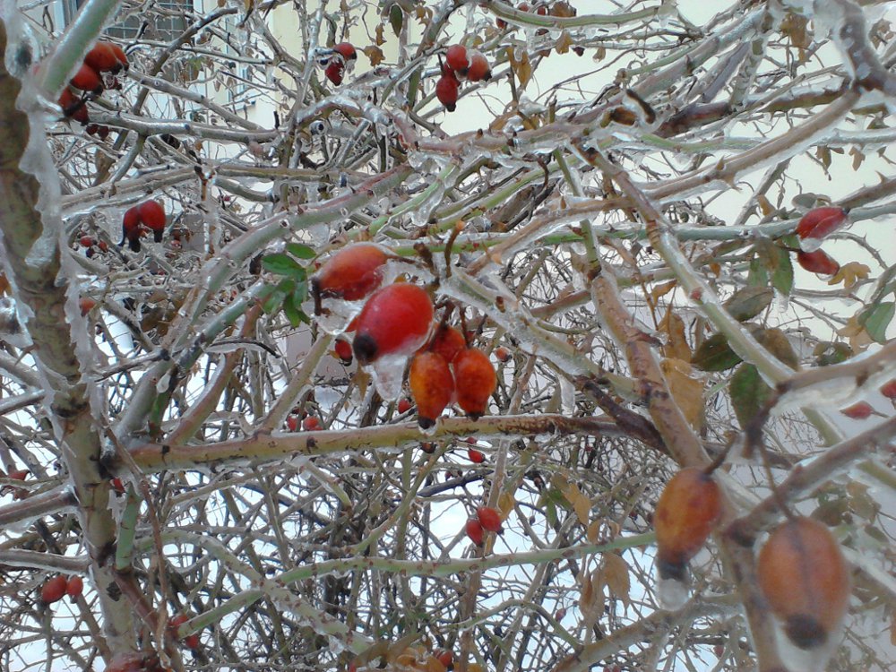 Красные ягоды стойко переносят непогоду. Как будто лед не сковал их, а взял под защиту.