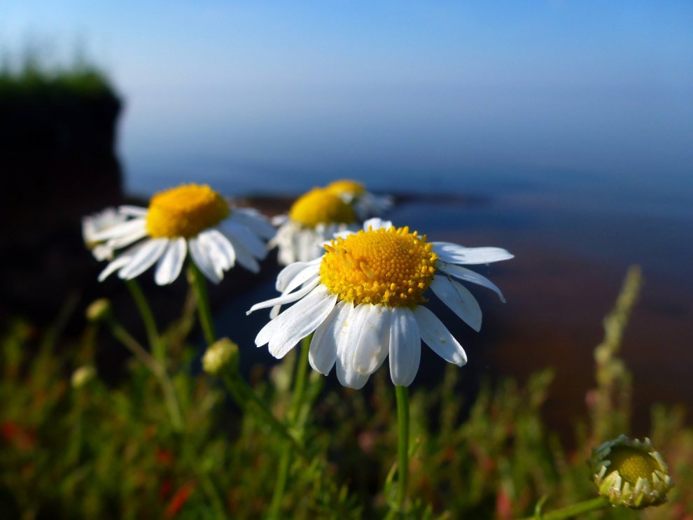 Ромашки, одиноко стоящие на крутом берегу, на фоне бескрайних просторов реки, привлекают внимание и настраивают на философский лад. А какие ощущения они вызывают у вас?