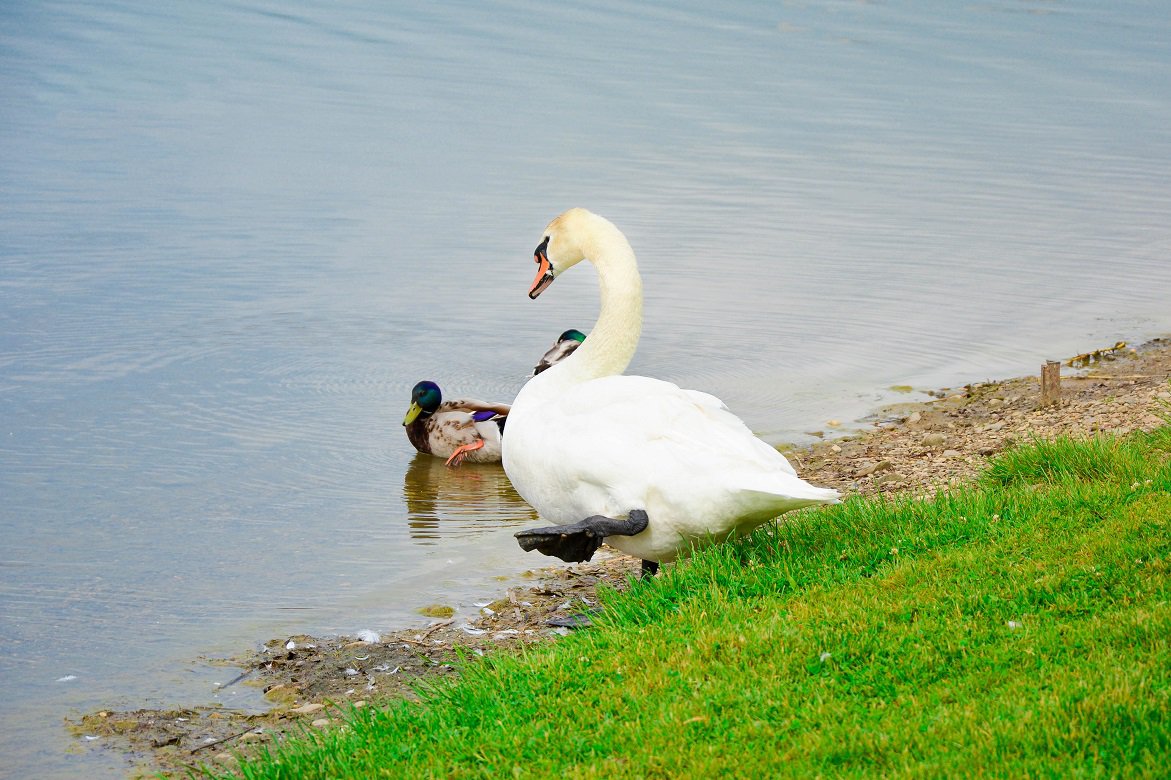 По соседству с утками на озере поселились лебеди.