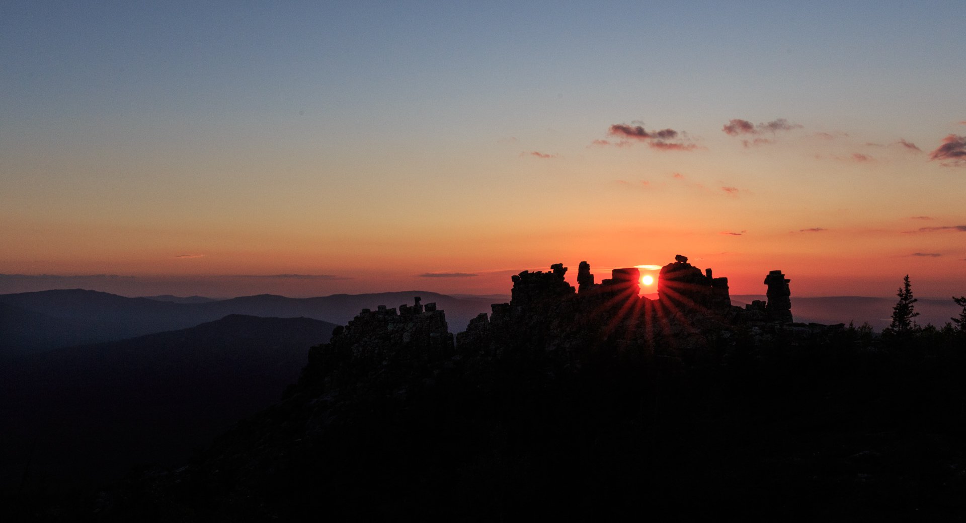 Закат над останцами горы Большой Нургуш, Национальный парк Зюраткуль, Челябинская область
