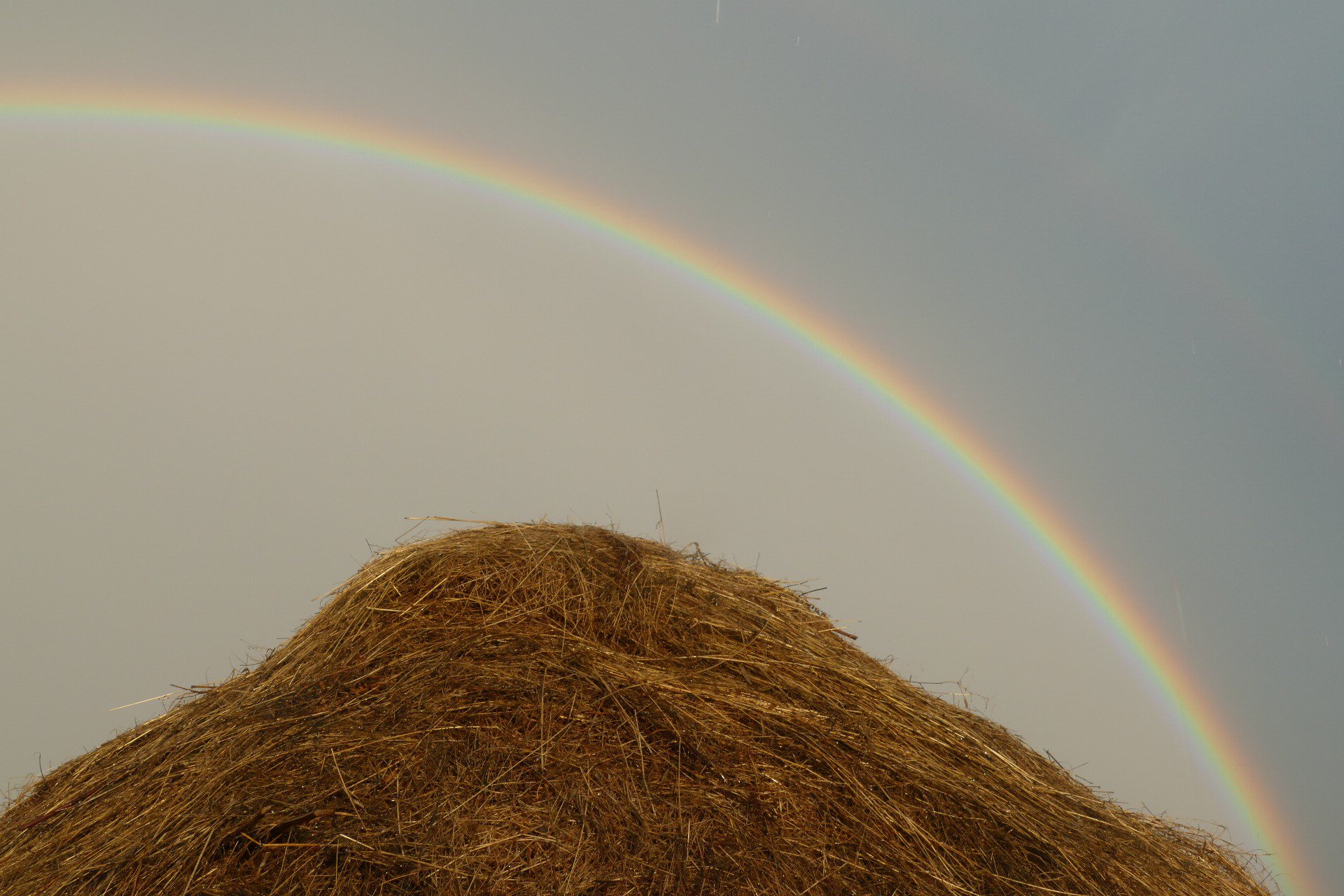 Последовании дни лета. Сено заготовлено. Пропитание для коровы на зиму обеспечено. Кто держит коровку, тот понимает как важна эта работа для благополучия хозяйства. Прошла гроза и заходящее Солнце высветило великолепную радугу. Западная Сибирь. п. Новый Васюган. 2016.