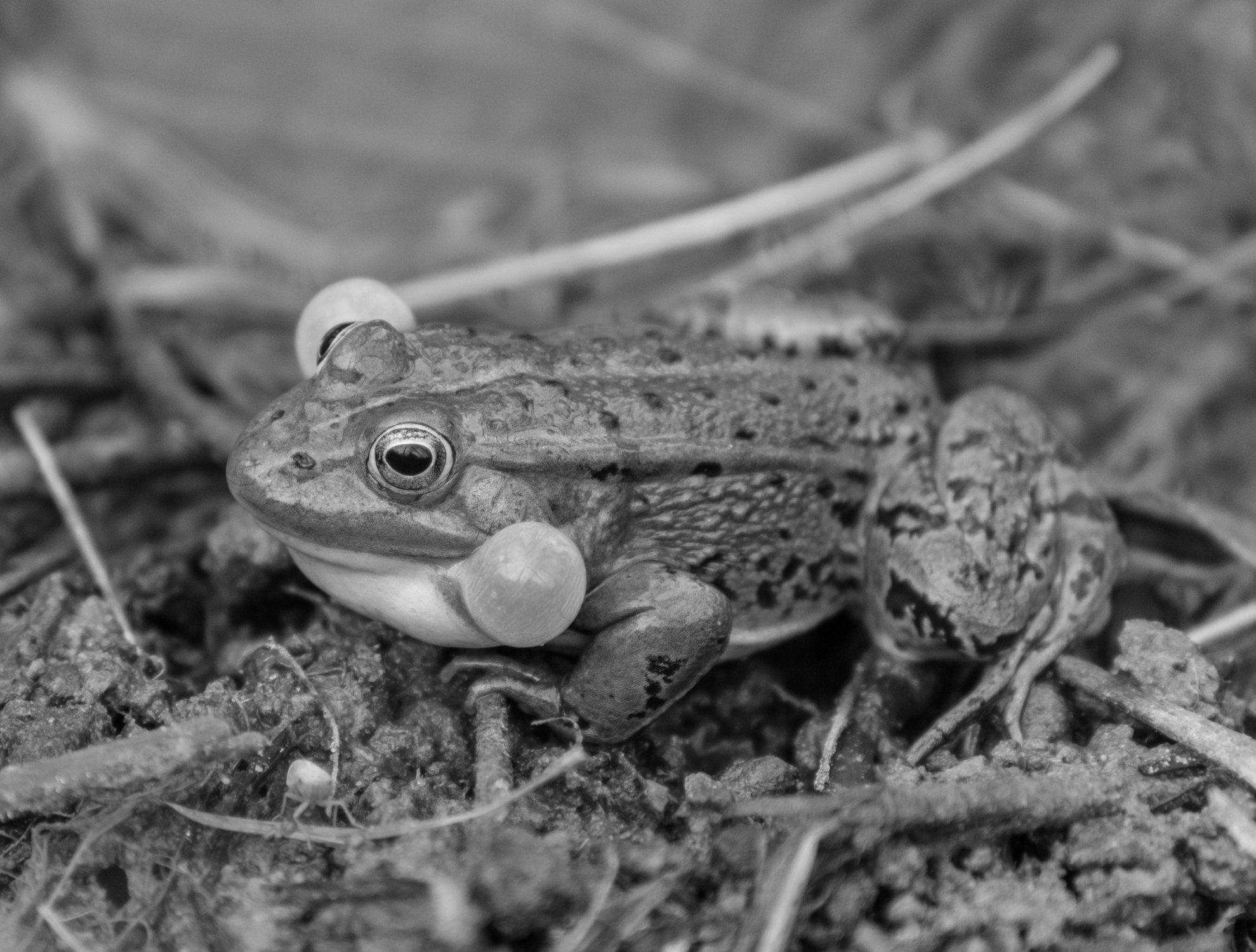 Самец озерной лягушки поет свою брачную песню.