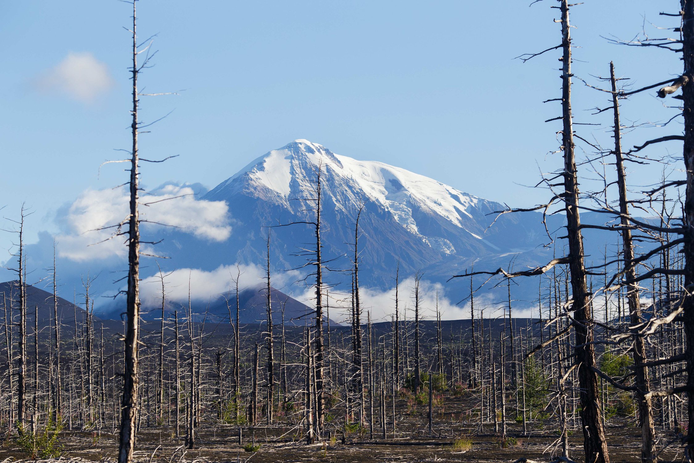 Деревья погибли, засыпанные шлаком в результате извержения Толбачика в 1975 году.
