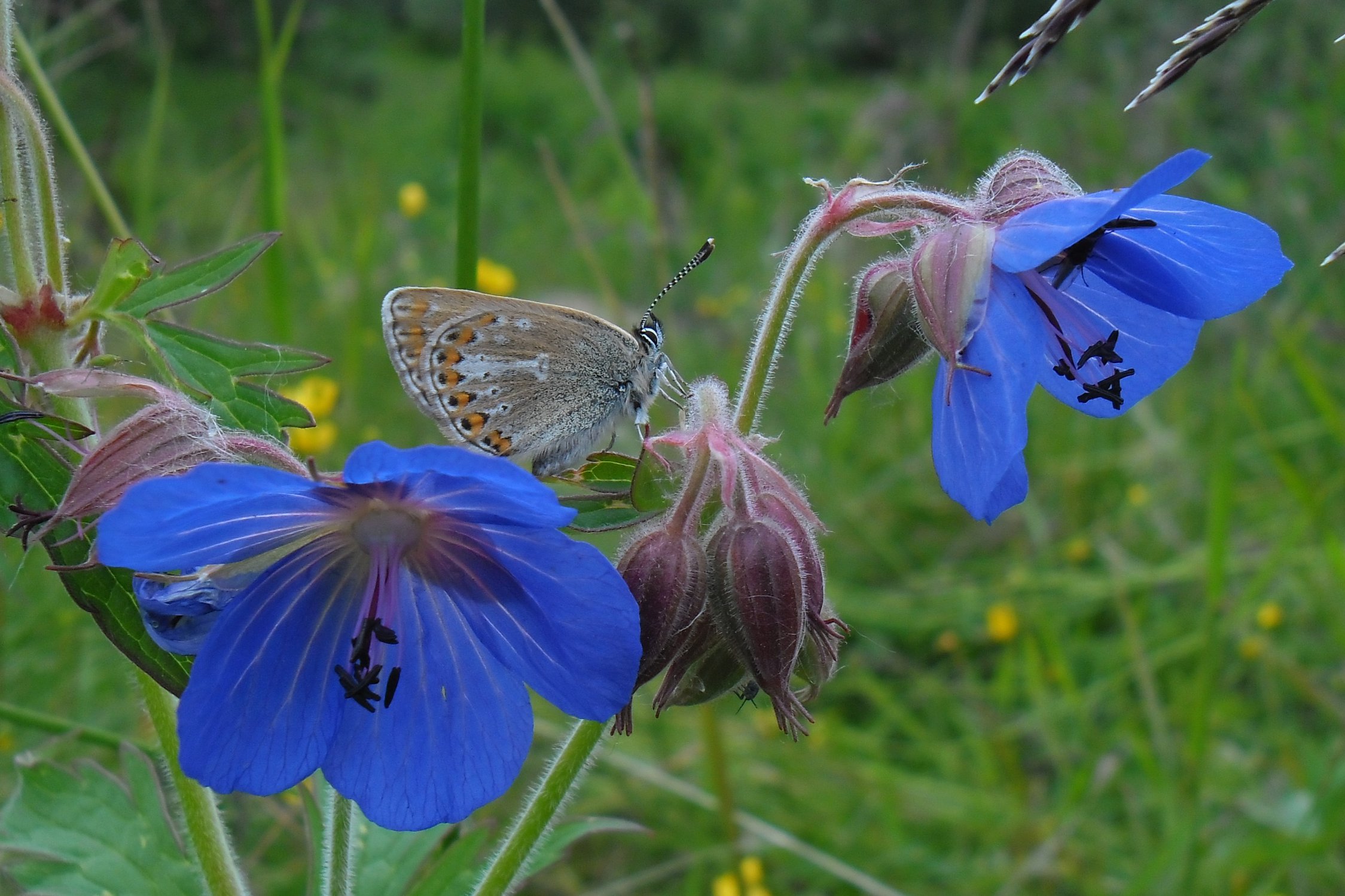 Маленькая бабочка голубянка икар на цветке луговой герани. Фото сделано на территории Кандалакшского природного заповедника, на побережье Белого моря