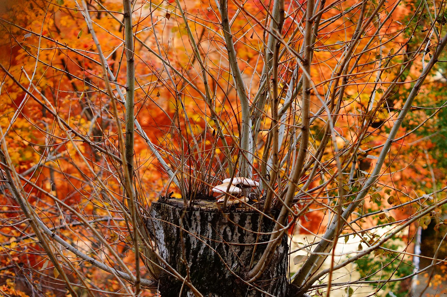На срезе ствола дерева, на высоте около шести метров сидит грибная семейка