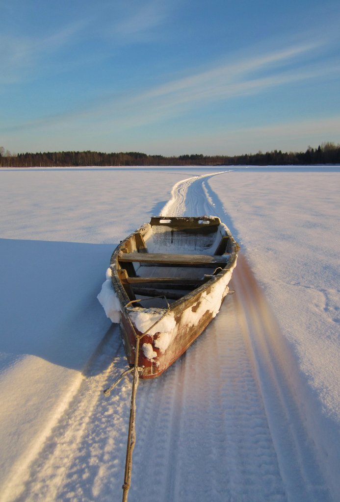 Запоздалая транспортировка лодки зимой на снегоходе.