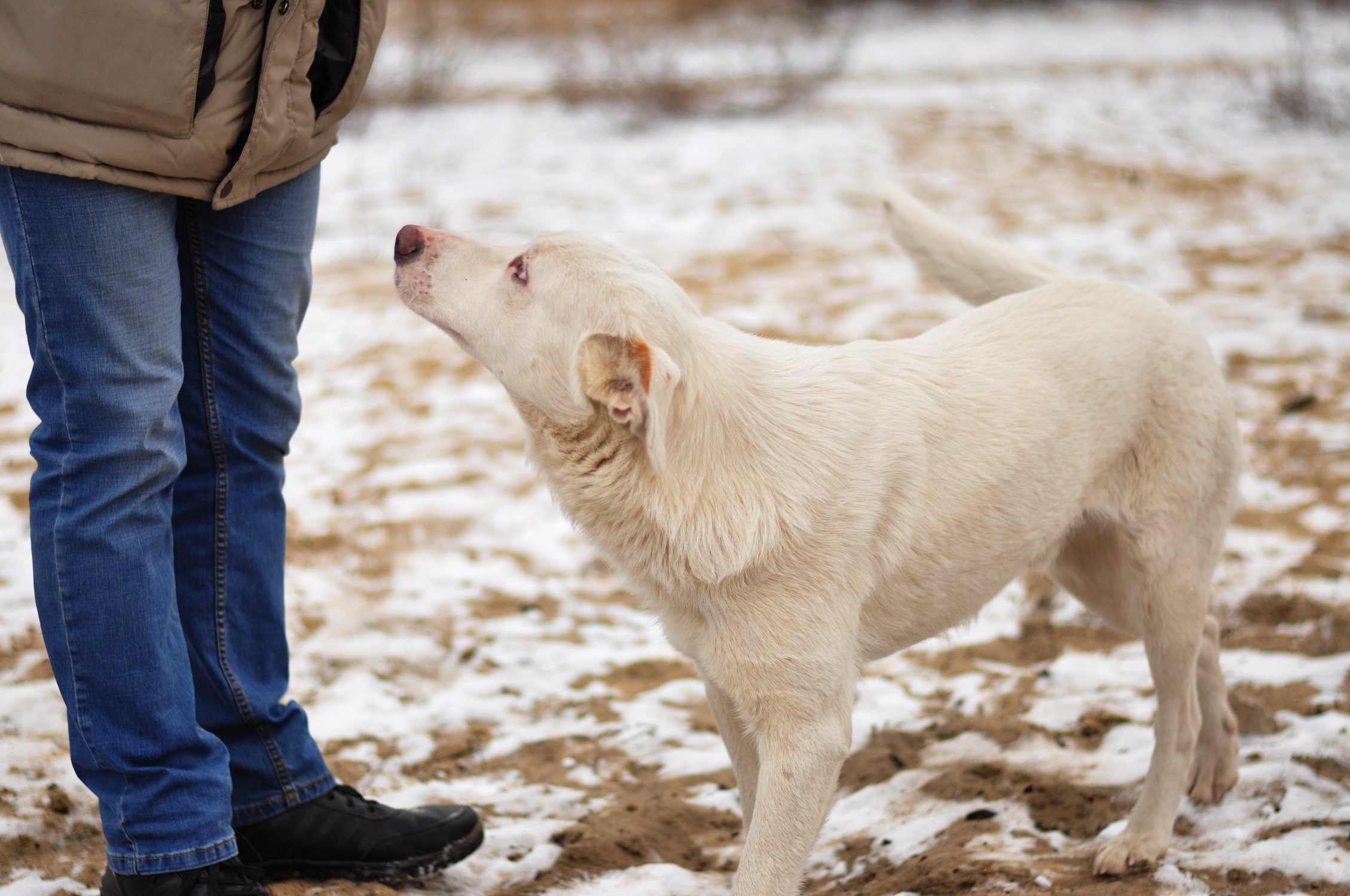 Этого пса зовует Снежок, он один из двух живущих собак у нас во дворе за гаражами, всегда ласковый и веселый, но в тот раз, когда была сделана эта фотография он сначала боялся подойти, видимо били.