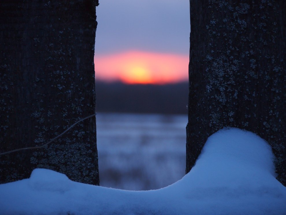 Закатное солнце заглядывает в зимний сад , укрытый снегом.