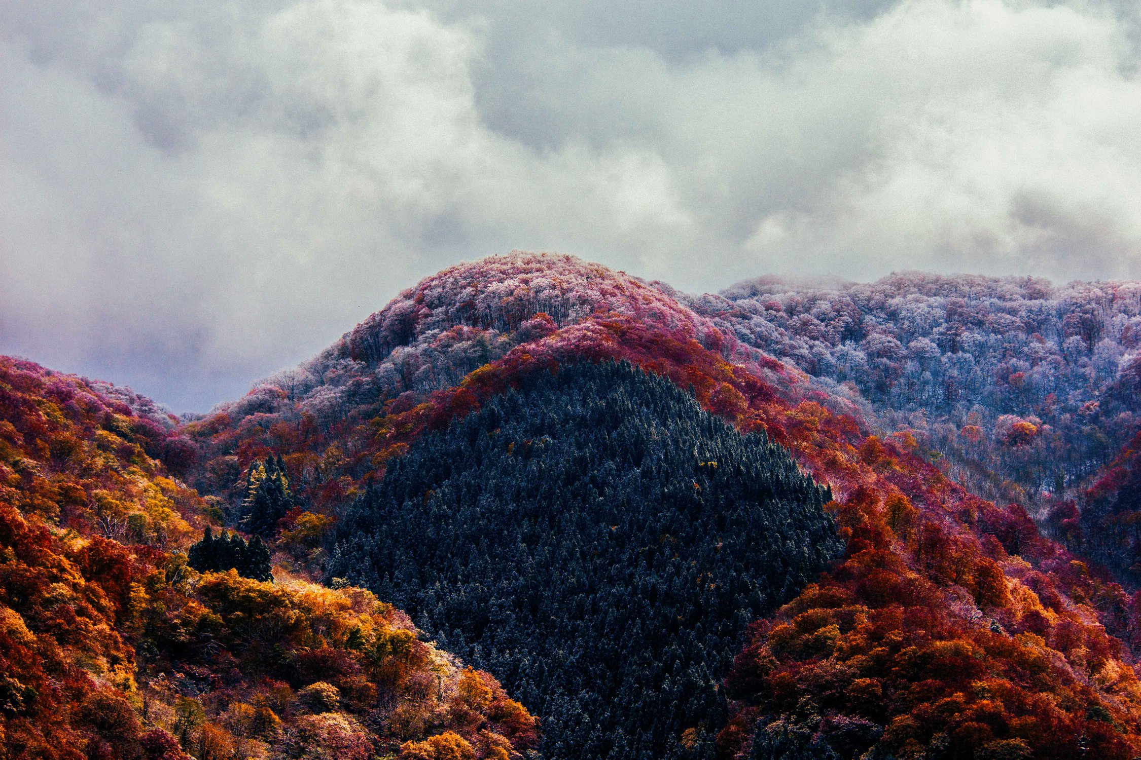 Осенние японские горы поражают буйством красок, а когда они припорошены снегом, появляются новые невероятные оттенки.