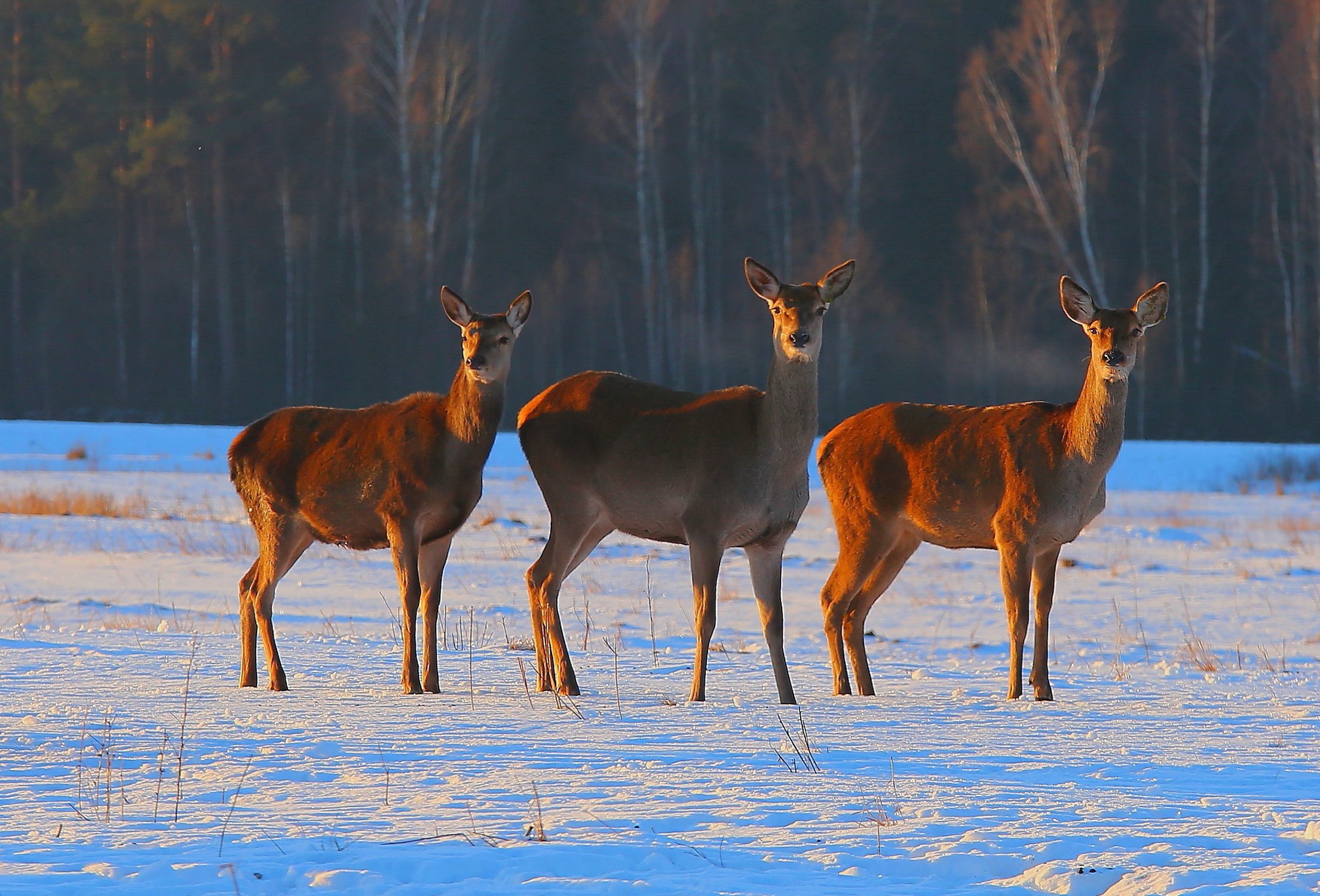 Оленихи, раннее морозное утро в национальном парке Нарочанский, Беларусь.