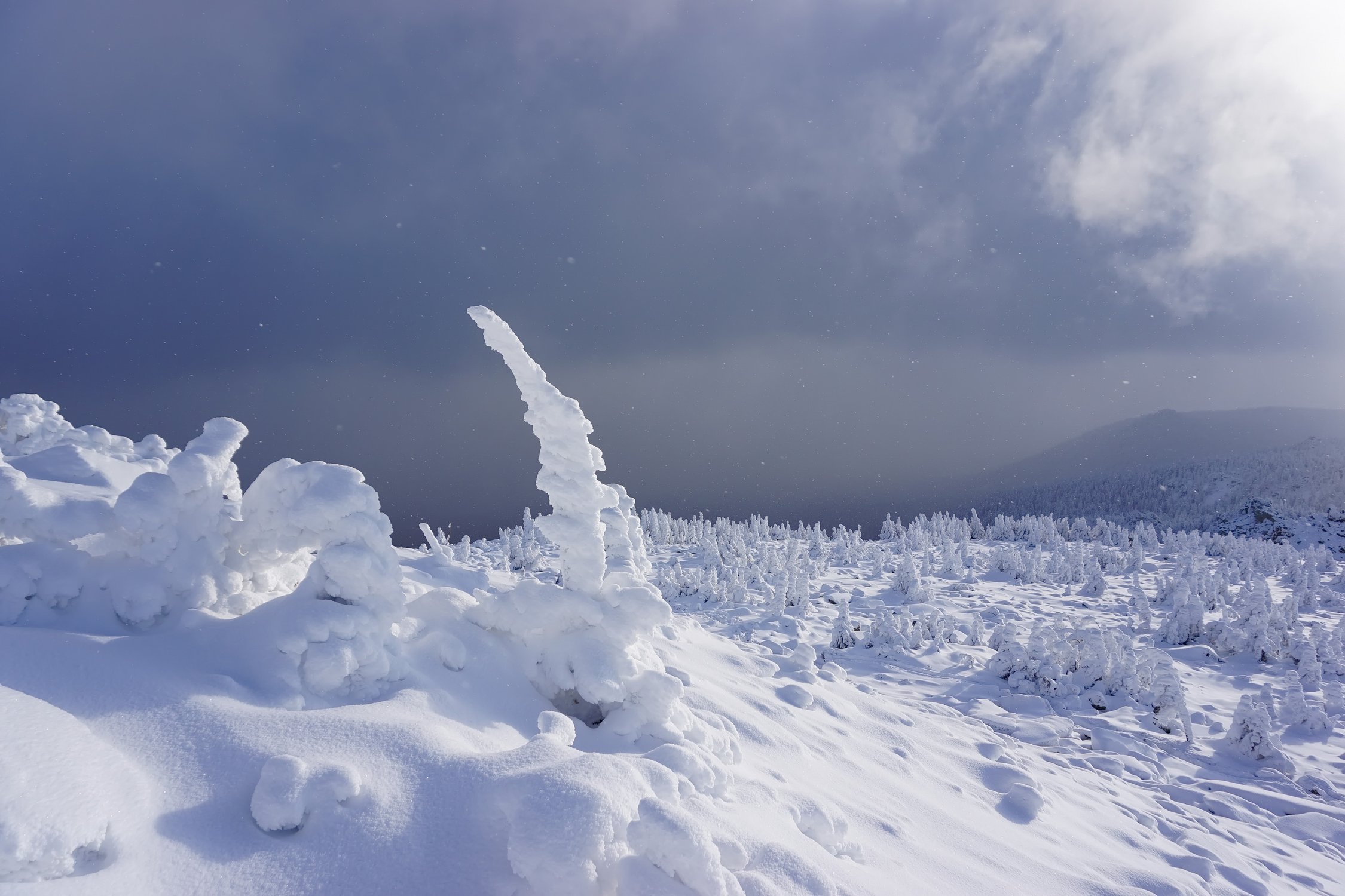 В кадре дерево растущее почти на вершине горы, укутанное зимним куржаком.