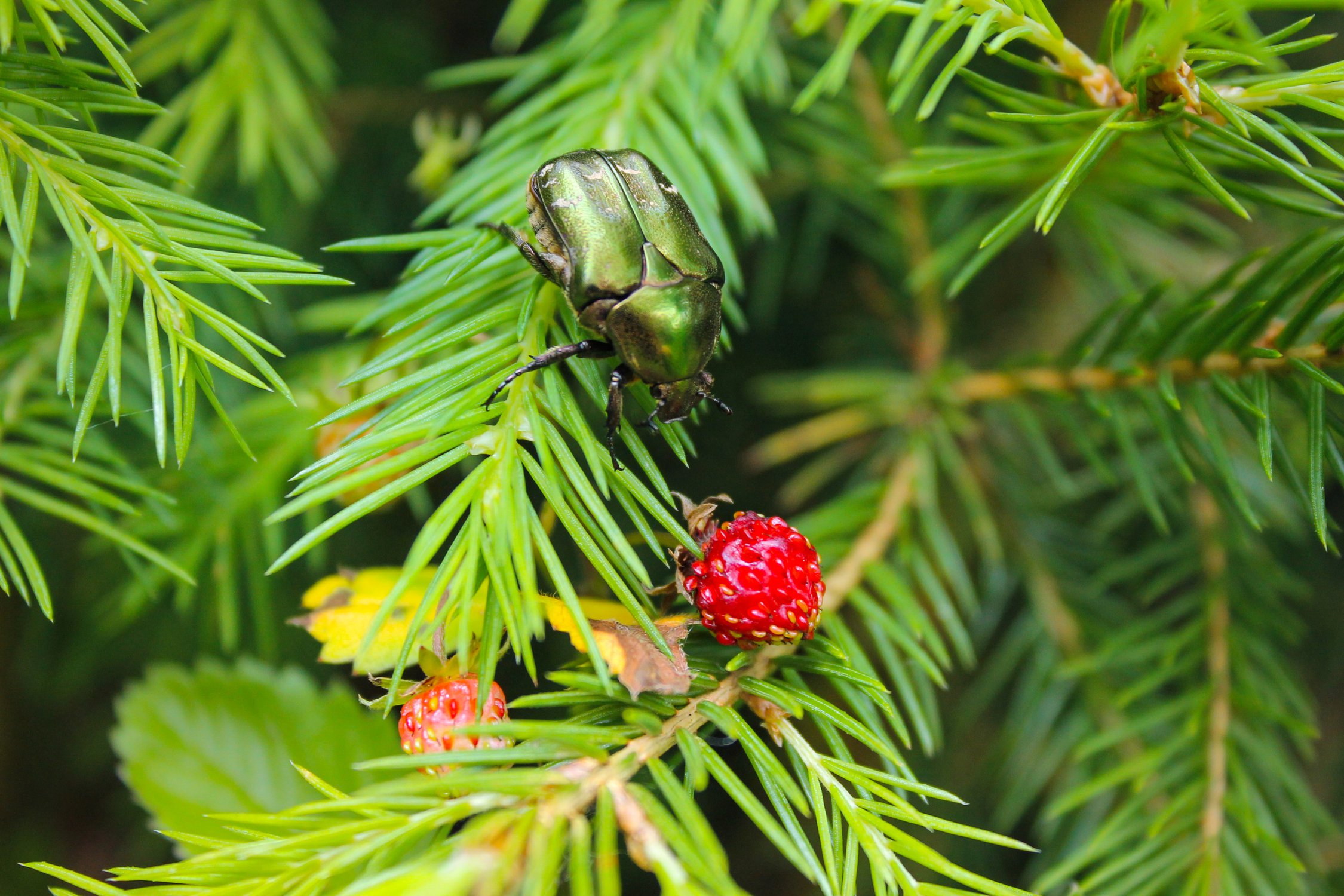 Бронзовка пришла посмотреть на ягоду земляники.