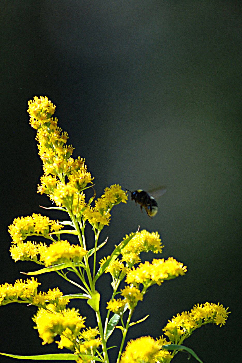 Золотая розга привлекает множество шмелей. Вот и ещё один заходит на посадку в поисках нектара.