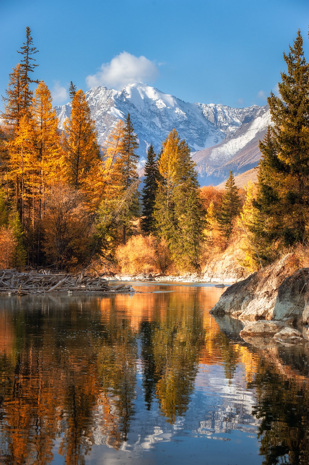 Осень на Алтае одно из самых лучших гор. Золото листвы, синева неба и белизна гор. И всё это находит своё место в спокойных водах прекрасной реки Чуя.