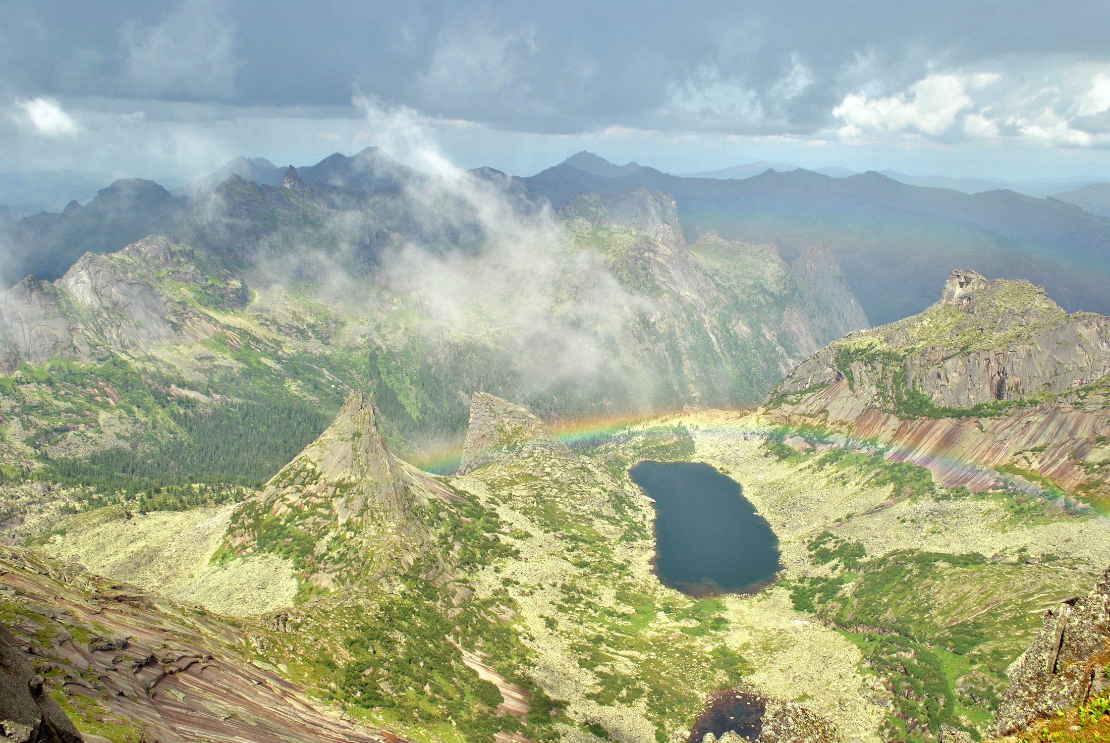 Ергаки после дождя - панорама горного массива Ергаки в Западных Саянах. Снимок сделан с перевала Птица. На панораме видны озеро Горных Духов и скала Парабола.