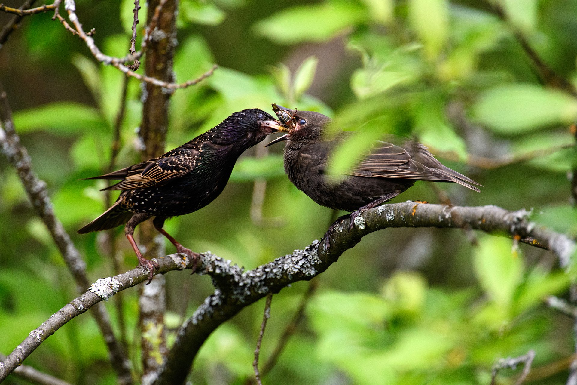 Этого кадра пришлось ждать часа полтора. Очень сложно следить за птенцами скворцов, которые летают за родителями и прося покормить их. В конце концов один птенец сел на ветку дерева на против меня, и стал ждать пока его покормят. Мне оставалось только дождаться его родителя и вовремя нажать на спусковую кнопку.