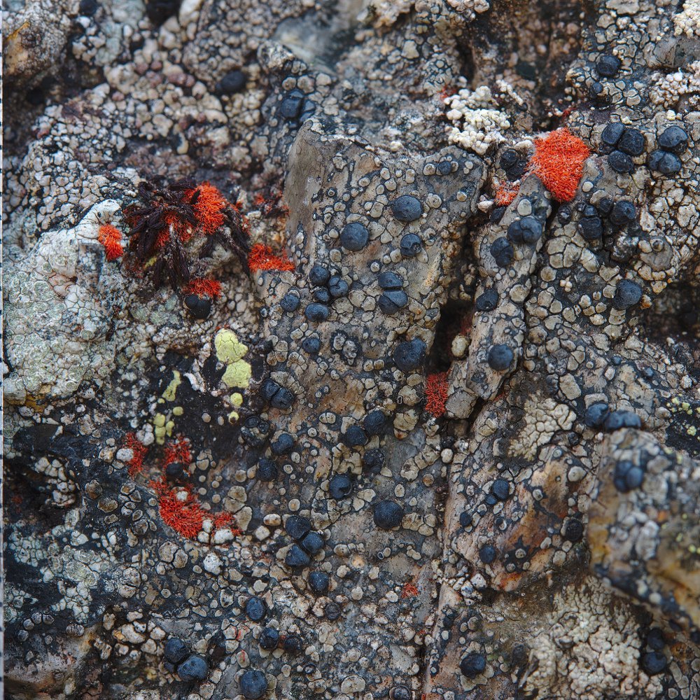 Один из лишайников, устойчивых к самым жестким условиям обитания, благодаря толстой "шкурке". Красные "кустики" рядом - водоросль Trenthepohlia. Хибинские горы (67.57868, 33.76269. 480 m).