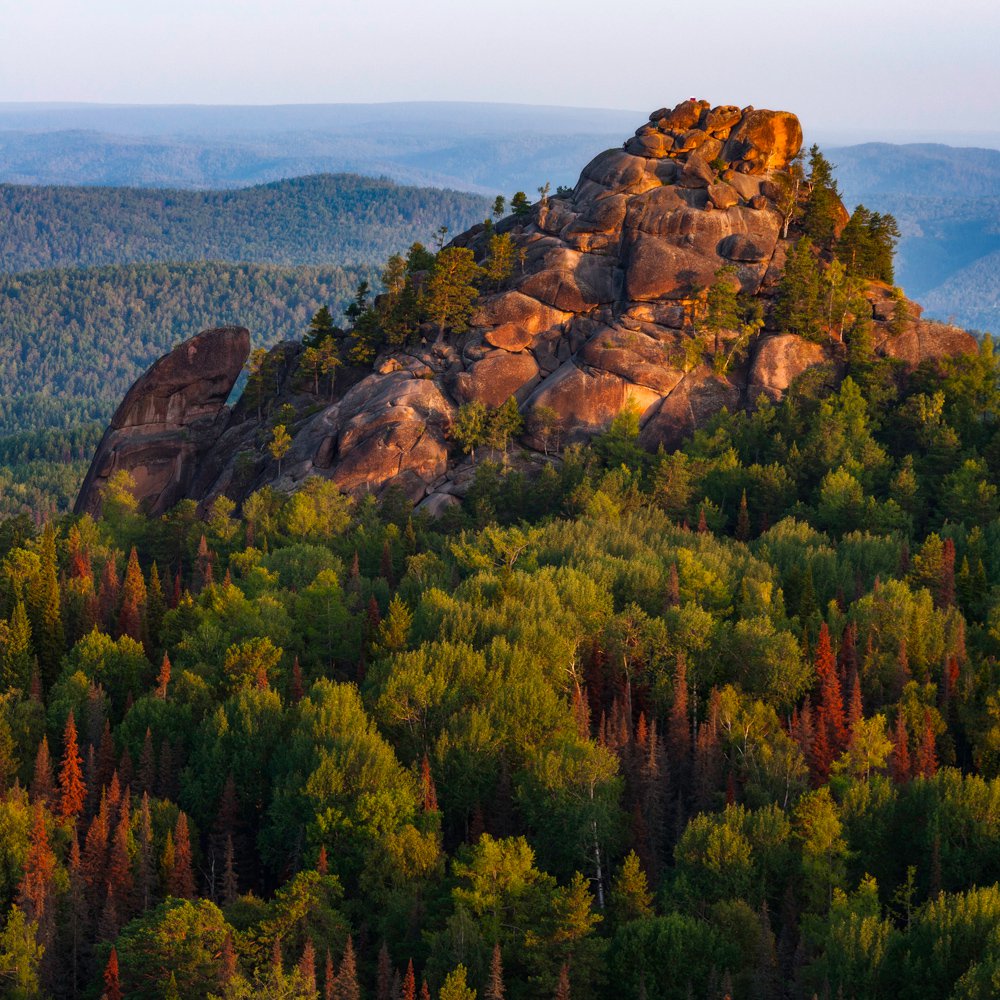 Первый столб в рассветных лучах, заповедник Столбы, Красноярский край
