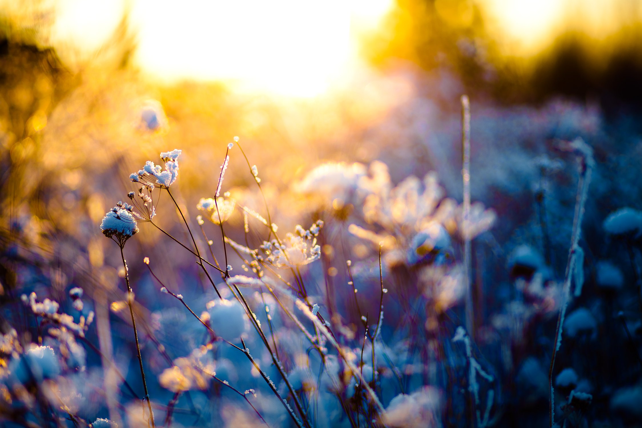 Заснеженная трава на закате солнца