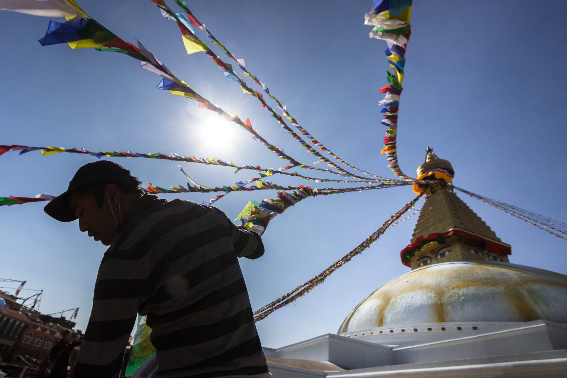 Катманду, Непал. Февраль 2018 Храмовый буддийский комплекс Бодна́тх. Служащий комплекса пытается починить порванные ветром веревки с молитвенными флажками