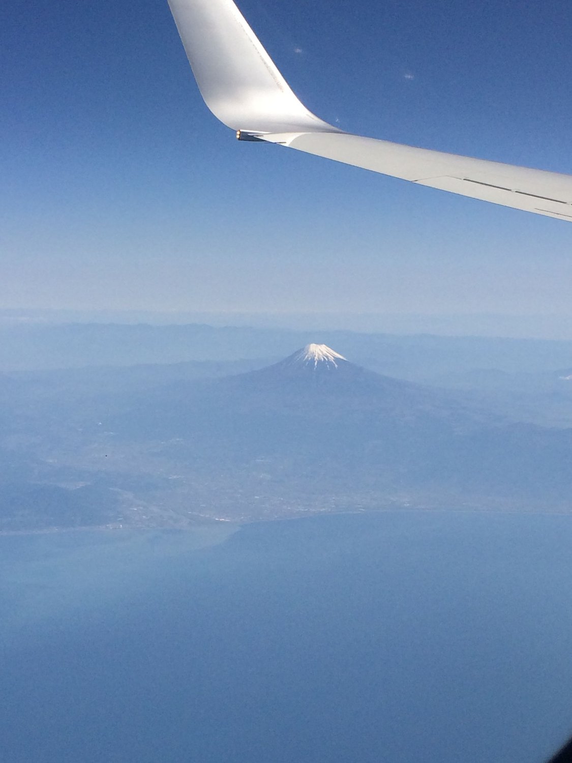 Фотография знаменитой горы с высоты. Удалось поймать хороший вид и в ясную погоду, что редкость. Специально в кадр включил крыло самолета, ибо хотел подчеркнуть изумление и попытаться передать те чувства обычного путешественника, неважно какой национальности, когда он видит символ Японии в своем иллюминаторе.